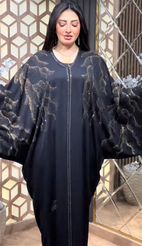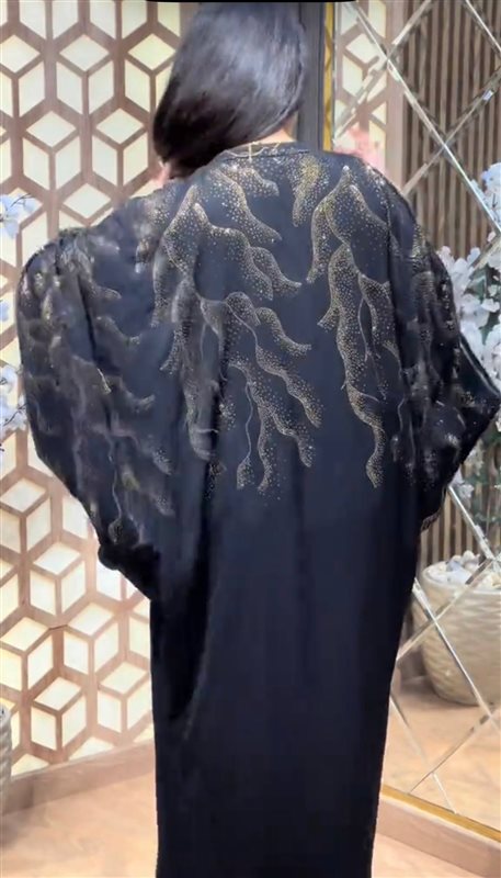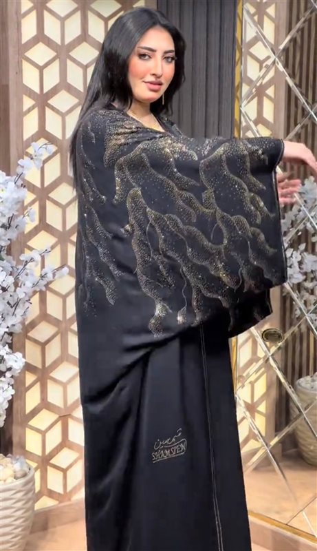 ملحفة فاخرة من قماش الحرير الناعم بتصميم أنيق، مزينة بتفاصيل استرس موزعة بشكل عشوائي على الصدر والظهر، تمنح القطعة لمسة فنية ولمعان راقٍ يلفت الأنظار.