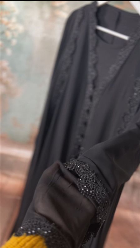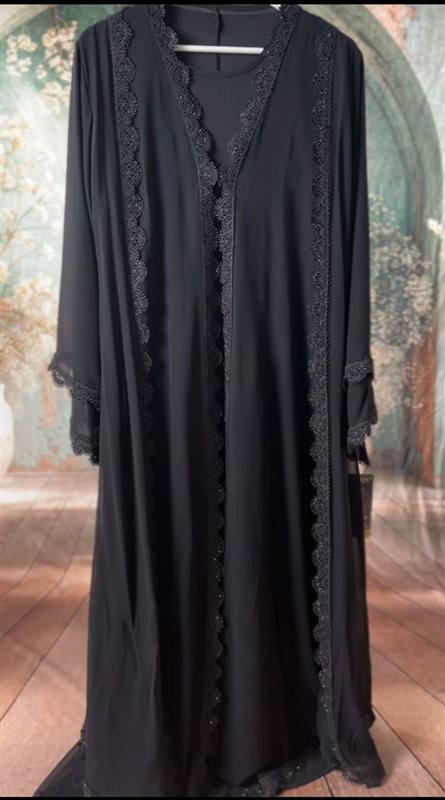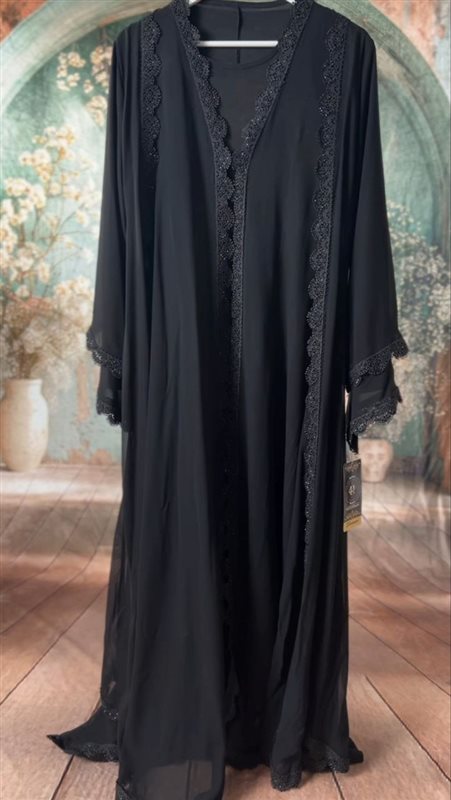 عباية بتصميم أنيق مكوّنة من طبقتين شيفون، مع روب شيفون متصل يعطي انسيابية وجمال للحركة.