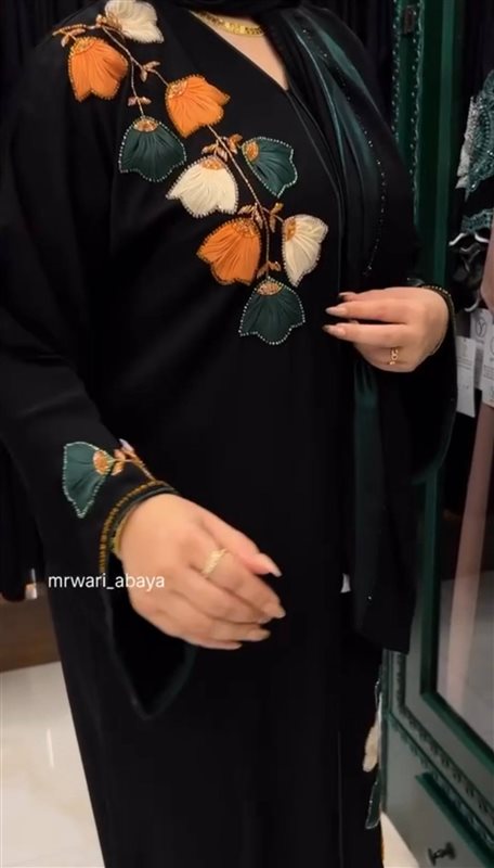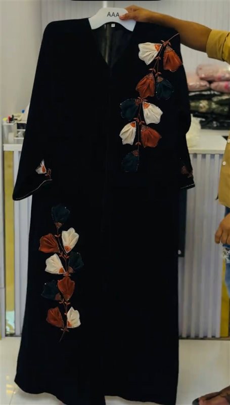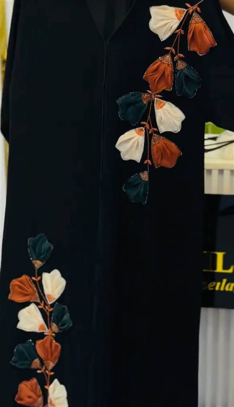 عباية حرير أنيقة مشغولة بتطريز هاند ميد ورد ملون بدقة عالية.