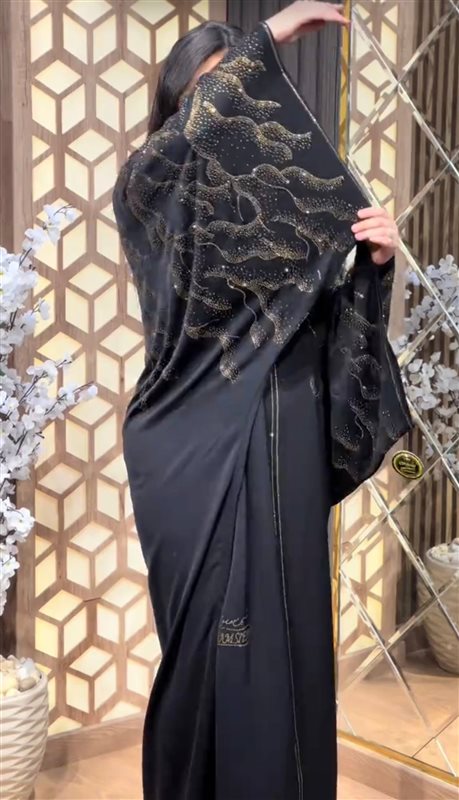 ملحفة فاخرة من قماش الحرير الناعم بتصميم أنيق، مزينة بتفاصيل استرس موزعة بشكل عشوائي على الصدر والظهر، تمنح القطعة لمسة فنية ولمعان راقٍ يلفت الأنظار.