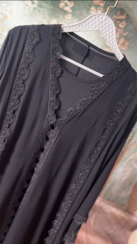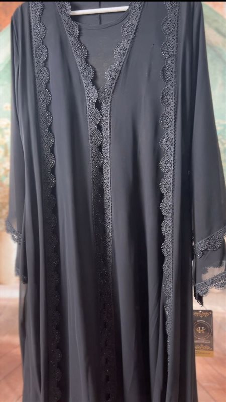 عباية بتصميم أنيق مكوّنة من طبقتين شيفون، مع روب شيفون متصل يعطي انسيابية وجمال للحركة.