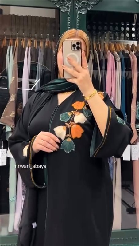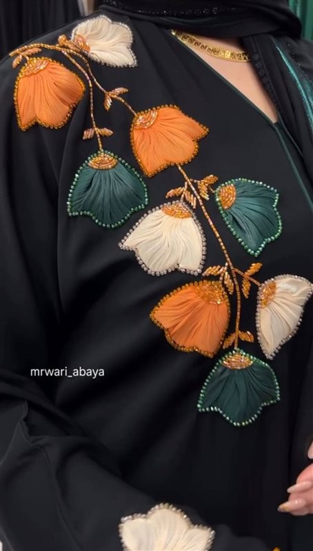 عباية حرير أنيقة مشغولة بتطريز هاند ميد ورد ملون بدقة عالية.
